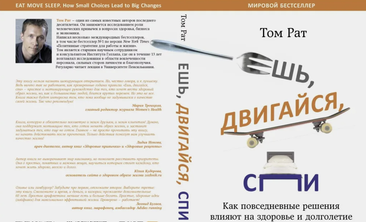 Том Рат — известный исследователь и автор бестселлеров, посвятивший свою карьеру изучению вопросов здоровья и благополучия. Его книга «Ешь, двигайся, спи» представляет собой комплексное руководство по улучшению качества жизни через три ключевых аспекта: питание, физическая активность и сон.