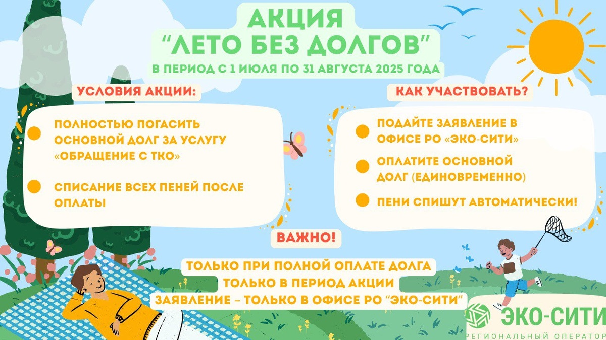 Региональный оператор «Эко-Сити» объявляет акцию «В лето без долгов». В период с 1 июля по 31 августа 2025 года потребителям услуг «Обращение с ТКО», имеющим просроченную задолженность, предоставляется возможность списания пеней. 📝Условия акции: Необходимо полностью и единовременно погасить основной долг за услугу «Обращение с ТКО» в период действия акции. При выполнении этого условия вся сумма начисленных пеней будет списана. 📰Порядок участия в акции: - Обратитесь в клиентский офис «Эко-Сити» и подайте заявление на участие в акции. - Сотрудник оператора рассчитает сумму, подлежащую оплате. - Произведите единовременную оплату основного долга. - После зачисления платежа на ваш лицевой счет, пени будут списаны. *подать заявление можно только в клиентском офисе 📞Подробная информация (по будням с 8:00 до 20:00 ч.): 8 (347) 298-04-90 8 965-939-49-00 (Билайн) 8 989-959-49-00 (МТС) 8 937-497-49-00 (Мегафон).