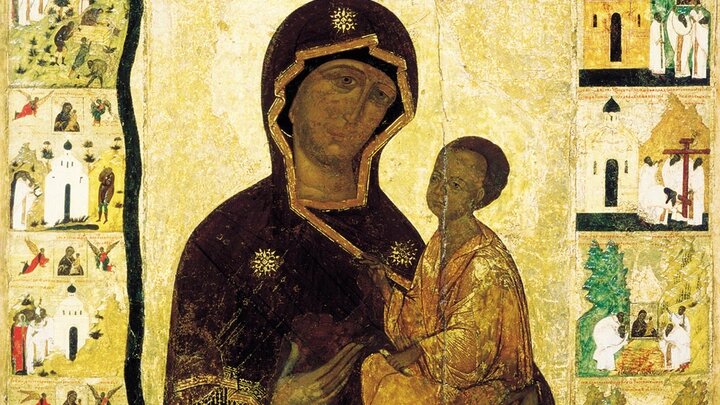 Согласно церковному преданию, Тихвинская икона принадлежит к числу икон, написанных апостолом и евангелистом Лукой. Это один из древнейших образов Богородицы, и, по преданию, икона хранилась в Константинополе до XIV века. Её связывают с так называемым Годигитрийским (Путеводительной) типом иконографии — когда Божия Матерь изображается держащей Младенца Христа на левой руке, указывая правой рукой на Него как на Путь, Истину и Жизнь.