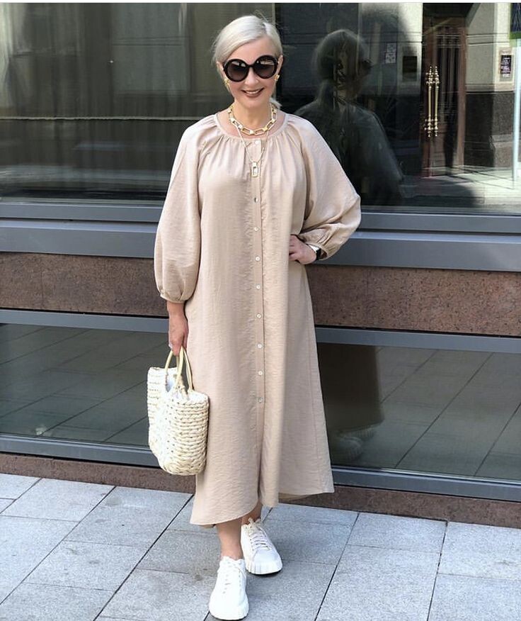 Если хотите быть стильной – просто будьте ей. Для этого не нужно ничего особенного, достаточно базовых вещей и умения их сочетать, а также желания обращать внимание на достаточно яркую одежду, которая будет хорошо сидеть и позволит выглядеть эффектно в любом возрасте. 1. Оригинальное льняное бежевое платье-рубашка романтического фасона с широким подолом, пышными рукавами-фонариками и полукруглым вырезом очень стильно смотрится и невероятно комфортно носится в летнюю жару. Красивое легкое платье в сочетании с удобными белыми кроссовками может стать центральной частью стильного повседневного гардероба современной зрелой женщины. 2. Стильное бежевое платье-рубашка длины макси с широкими рукавами, подвернутыми до локтей, и нарочито-небрежно расправленным воротником представляет собой модель свободную и очень удобную. Дополненное оригинальными замшевыми балетками с завязками через стопу, оно смотрится очень элегантно и женственно, дама в нем приобретает без преувеличения блестящий вид. 3. Я
