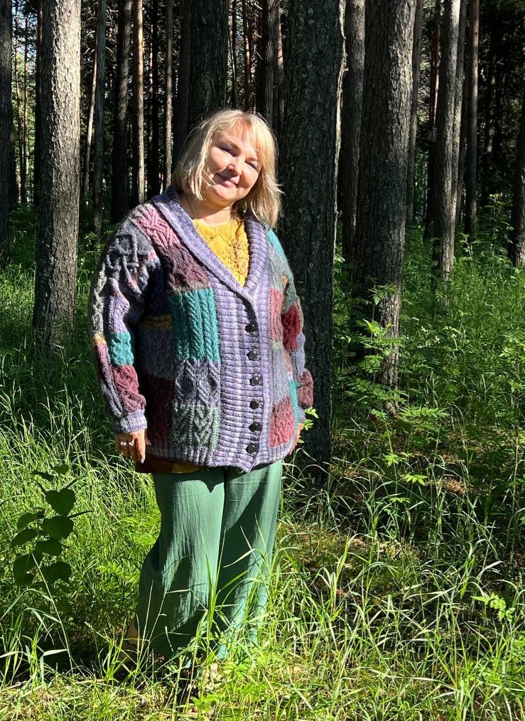 По сути, и рассказывать особо нечего, поскольку о своем кардигане "Три аккорда" я здесь писала не раз. Ещё бы - нынешний уже десятый (юбилейный!)по счету! Но всякий раз меня радует и удивляет, как душевно раскрывается пряжа дундага в каждой новой истории во всем своём цветовом многообразии. Это вариант по заказу исполнила, что и ворот шалькой, и пуговицы в наличии) Хозяйка кардигана и ростом повыше и стройнее, поэтому, уверена, что на ней кардиган будет смотреться краше. Мне же хотелось запечатлеть его для истории. И, надо сказать, позировать в шерстяном пинджаке в плюс 25 то ещё испытание, так что фотали быстро и по делу, с трудом успевая уворачиваться от мошкариных стай. Всякий раз стараюсь включать в историю новые мотивы аранов, чтобы и вязать нескучно и навыки отработать. Жаккардов нынче по минимуму, но истории это не портит.