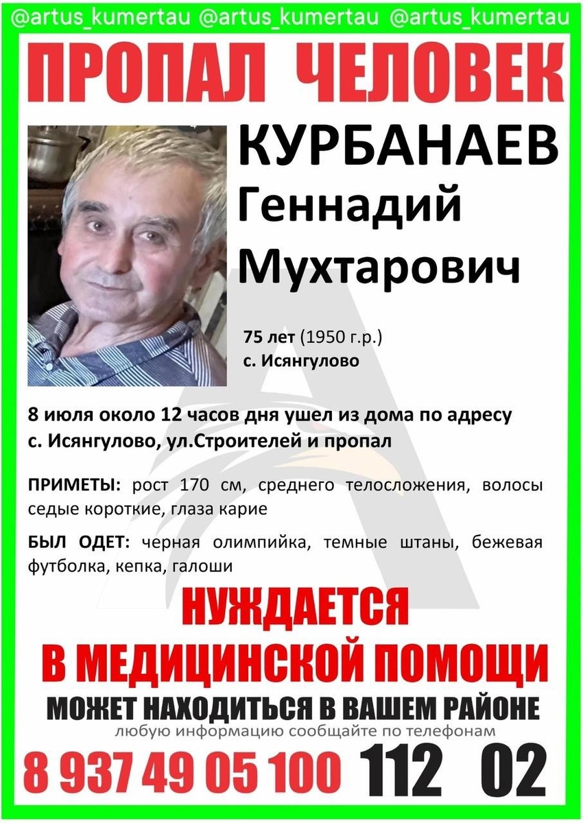 ‼️СРОЧНО НУЖНА ПОМОЩЬ ВОЛОНТЁРОВ! ‼️ Потерялся пожилой человек в районе парка "Ак сатыр". Курбанаев Геннадий Мухтарович (1950 г.р). Ушел из дома 8 июля в 12:00 часов , до сих пор его местонахождение неизвестно. Мог уйти в сторону посадки, близлежащие улицы - от колледжа до ФОКа. Возможно и в других местах. Возможно, стало плохо и где-то упал в траву. Если где-то увидели, звоните по номеру 89177566434 ‼️Было принято решение организовать ПОИСКИ ВОЛОНТЁРАМИ. Для формирования волонтёрской группы нужна помощь зианчуринцев. 📌Сбор в 14.00 в парке "Ак Сатыр" Одежда должна соответствовать. Трава высокая. НЕ ОСТАВАЙТЕСЬ РАВНОДУШНЫМИ!