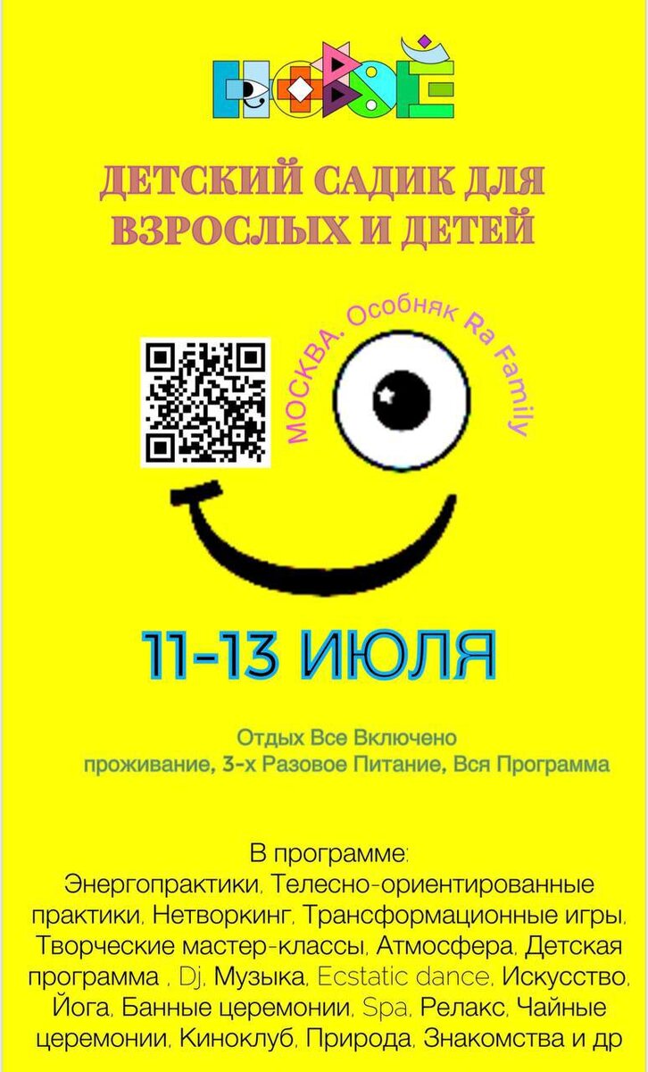 Наш Детский садик не только для взрослых здесь можно и детям. Берите деток с собой. Им в новом измерении всегда весело и интересно. Для них будет представлена творческая и интересная детская программа. У нас безопасное уютное пространство, а также, есть аниматоры, которые увлекут их интересными мастер-классами На фестивале будет представлена детская программа. Детям с 2 до 12 лет скидка 50% включая 3-х разовое питание (размещение вместе с родителями на одном кровати , либо 20% скидка на отдельной кровати ). Дети до 2-х оплата только питания. ✅Купить билет на фестиваль со скидкой через бота @novoeizmereniebot ✅Купить билет на фестиваль через сайт https://cbiletom.ru/event.php?event=7162