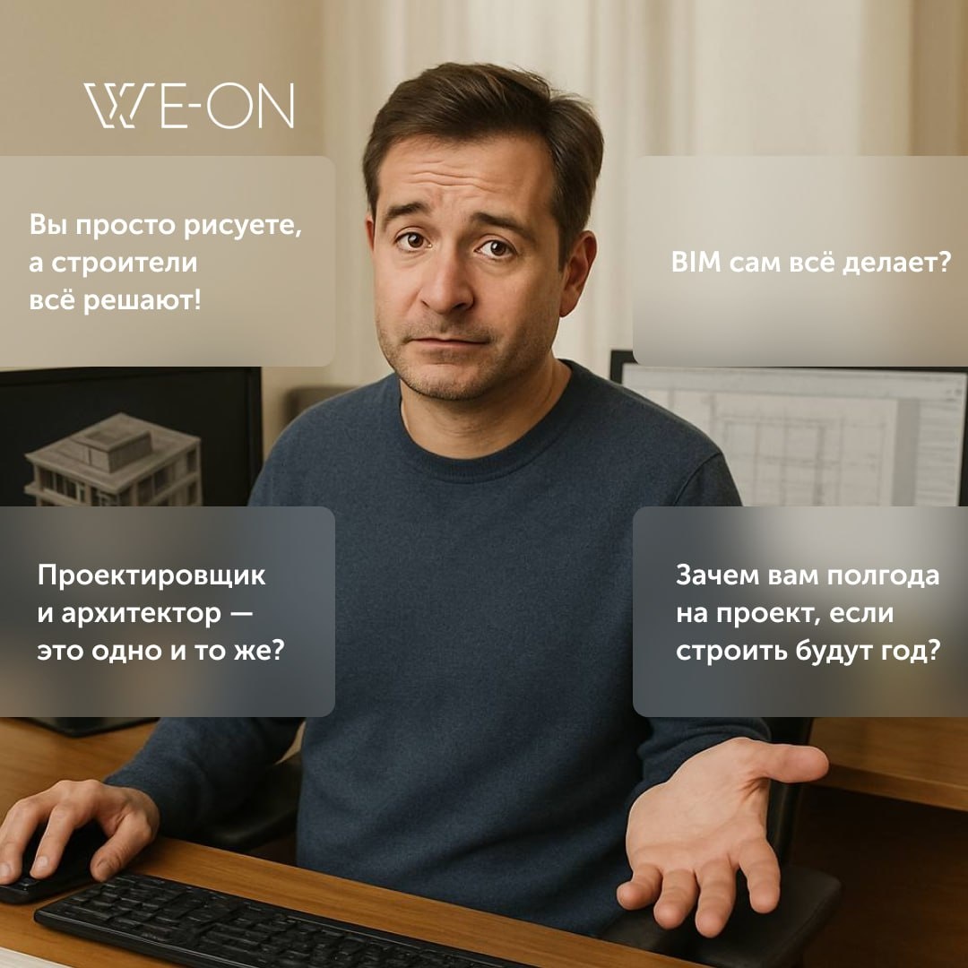 Мифы о проектировщиках, в которые верят заказчики 👨🎨 «Вы просто рисуете, а строители всё решают!» — Нет. Мы просчитываем, как будет жить здание 🤖 «BIM сам всё делает?» — Было бы здорово. Но за каждой моделью — человек, а часто — целая команда ⚡️ «Проектировщик и архитектор — это одно и то же?» — Нет, но мы умеем договариваться 🔃 «Зачем вам полгода на проект, если строить будут год?» — Потому что лучше ошибиться в модели, чем на стройке #шуткисофисом #проектировщикитожеулыбаются #weon