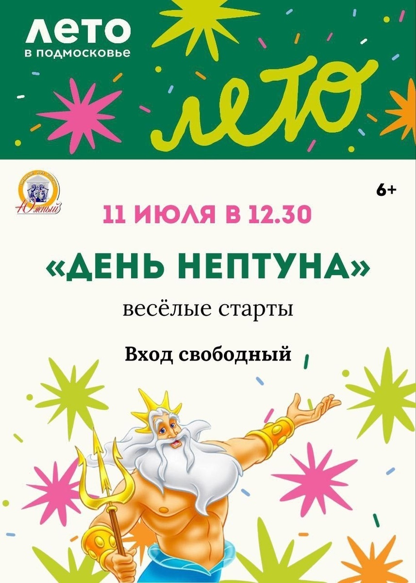 ✨ Дорогие друзья! Приглашаем вас на весёлые старты «День Нептуна» 🐠 💦 Когда? 11 июля в 12.30 Где? Площадь ГДК «Южный» 🚫 Возраст: 6+ 📆 11.07.2025🕒12:30 🏢 Городской дом культуры «Южный» 📍 г.о.Домодедово, мкрн.Барыбино, ул.Южная, стр1А 💰 Вход свободный❗️ ✅ Мероприятия Домодедово https://dzen.ru/id/66f10385cc4c5a16f7b5fb02 http://vk.com/domodedovo_events http://dzen.ru/domodedovo_events