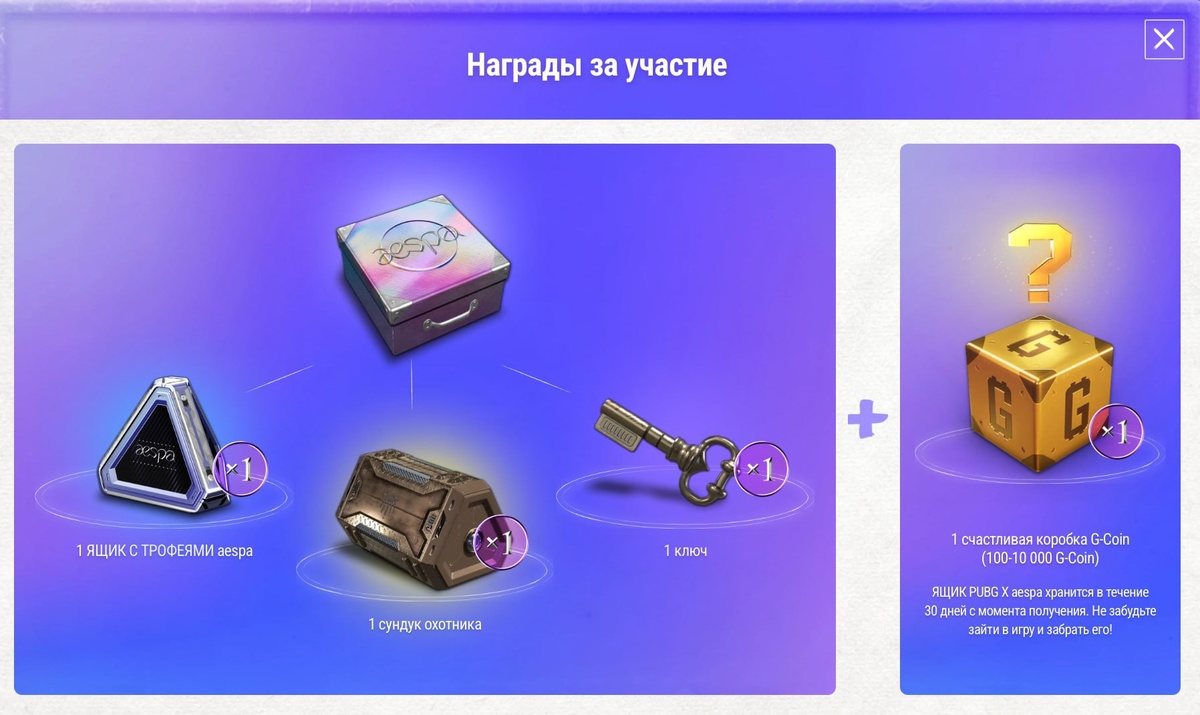 ➖При входе в игру получаем коробку G-)Coin, ящик с трофеями aespa, сундук охотника и 1 ключ. (а и 1 ключ. )