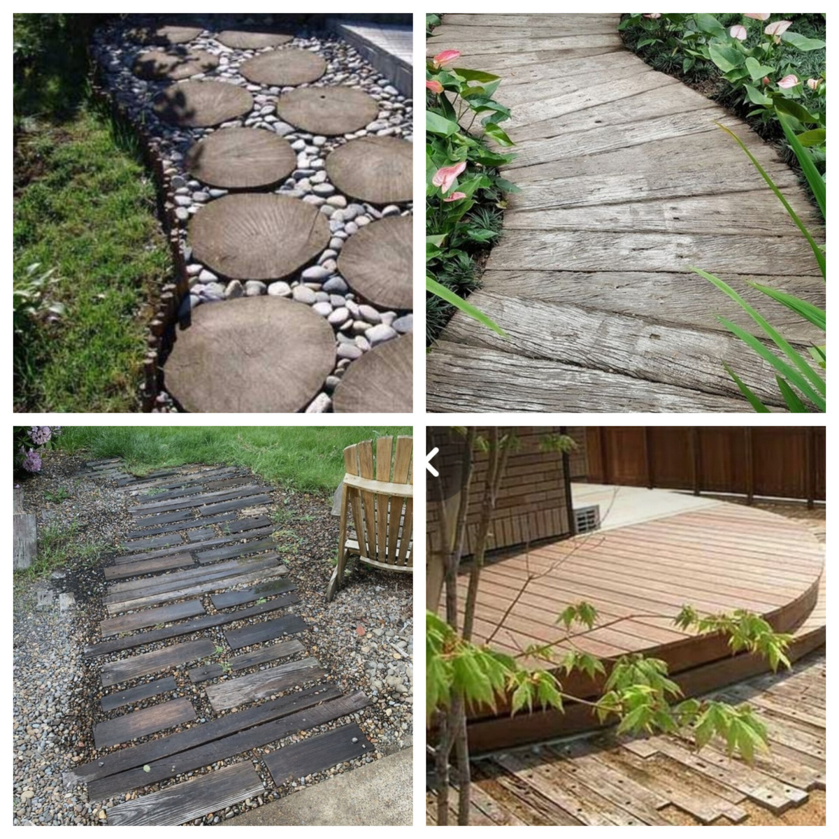 Если бы я жила на материке и гораздо севернее, я бы использовала дерево. Вы знаете, что во многих деревнях на том же Урале дворы застелены толстыми досками? А в Беларусии я вообще в Новозыбково видела дощатый тротуар. Кто скажет, что доски гниют... Нет! Дощатому двору у бабушки более 50 лет. Возможно и меняли доску-две когда-то, не знаю, такое ощущение, что им сносу нет. А что мешает кинуть на дорожки вместо плит красиво отпиленные куски доски? В интернете полно подобных картинок. Причём доску можно брать и старую, а если обжечь, то прослужит она намного дольше.
