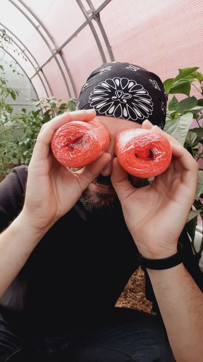 Вот наш «фирменный» способ подвязки перцев. Одним шпагатом от тросса вниз к перцу и через кольцо/клипсу обратно вверх к троссу (или каркасу теплицы) и обратно вниз к перцу — и так пока все перцы не закончатся!😁
