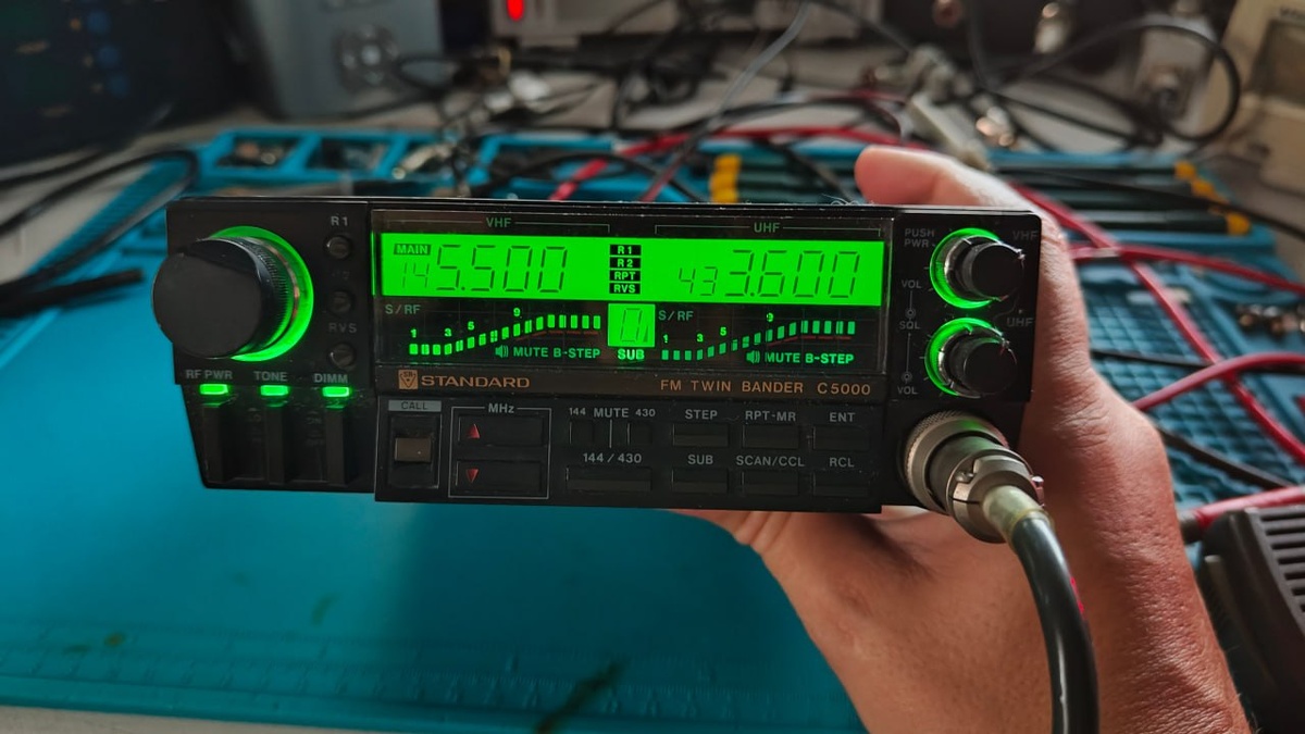 Итак, перед нами Standard Twin Bander C5000. Весьма пожилой аппарат, но вполне себе живой, хотя и с нюансами. Не регулируются шумодавы, отвалилась пайка на кабеле диапазона 70см, а так, бодрячком. Принимает и передает. 👍🏻