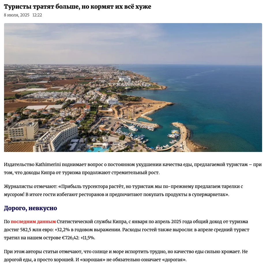 Журналисты с кипрского издательства "Ежедневно" налили свои глаза недоумением и, наконец, рассказали то, что я знал за Кипр уже много лет. Оказывается, кипрские рестораны шкварят всякий дрэк для туристов за много денег. Через такого подхода инородцы предпочитают делать обеды и ужины у супермаркетах и пекарнях, а самое главное - больше не делать отдых на остров, потому что "дорого и невкусно". Надо сказать, мы иногда делаем морду, что мы туристы и живём у кипрских отелях. Но мы уже давно бросили этих глупостей пытаться найти что-то вкусное в туристических кипрских рестиках - они мелко плавают рядом аж с английскими пабами.