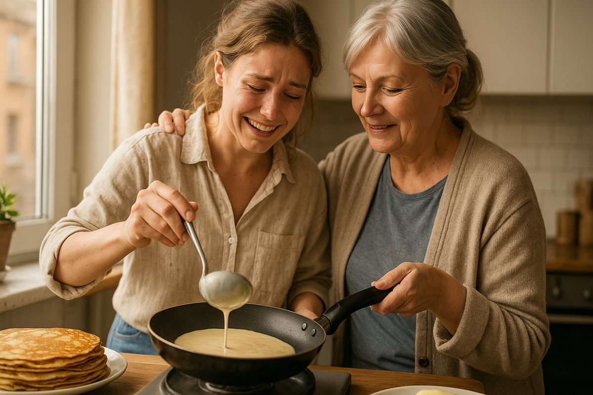 Мы стояли вдвоём у плиты: я мешала тесто, она показывала, как правильно держать половник, чтобы “кружочек был ровный и тонкий”. Дочка время от времени подбегала, утащив горячий блин прямо с тарелки, и визжала от восторга, Сергей — впервые за долгое время — подошёл, сел за кухонный стол и начал рассказывать, как в детстве они пекли блины всей семьёй.