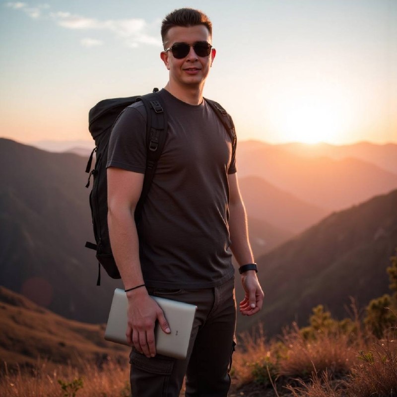 НЕЙРОФОТОСЕССИЯ 💫 Промт недели: A man standing on a hill with a backpack and laptop in hand, sunrise behind mountains, wearing cargo pants and sunglasses, modern explorer energy Мужчина стоит на холме с рюкзаком и ноутбуком в руке, на фоне восход солнца и горы, на нём карго-брюки и очки, энергия современного исследователя 👉🏻Подробная инструкция тут Тестируйте и присылайте свои варианты в комментариях!⚡️ @shvedkovpro #промтнедели