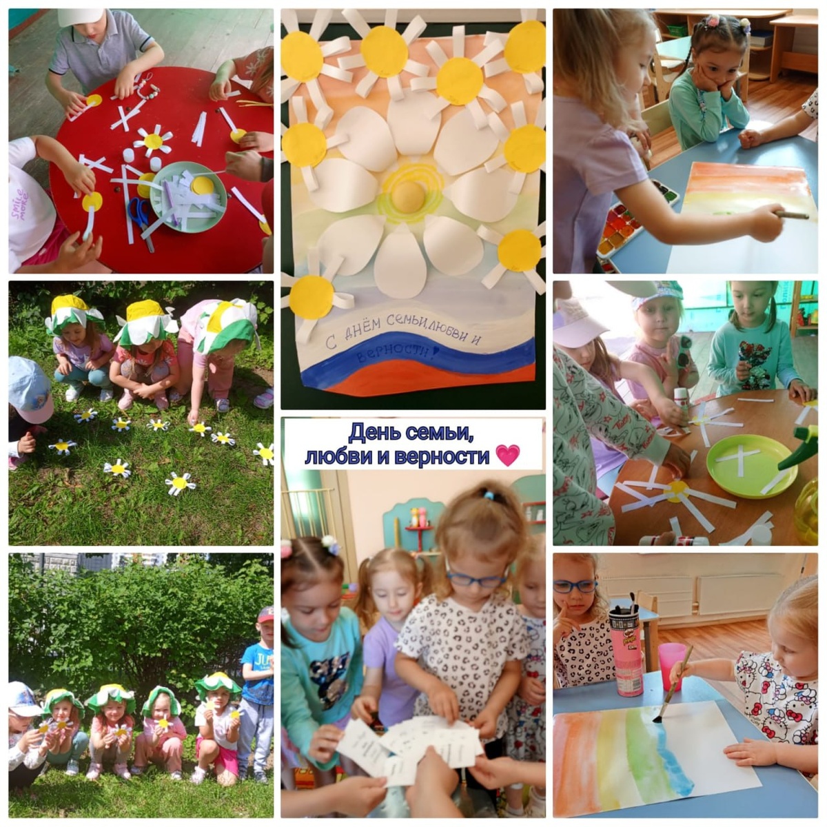 День семьи, любви и верности в дошкольном отделении Родничок Слова «семья, любовь и верность» Огромный смысл в себе несут. Там, где семья, — всегда есть нежность, Там, где любовь, — всегда нас ждут, А там, где верность, — доверяют Без лишних и ненужных фраз. Пусть эти чувства процветают И счастьем окружают нас! Семья — это то, что дает нам силы. Любовь — это то, что греет наши сердца. Верность — это то, что заставляет верить в чудеса и полностью довериться любимому и близкому человеку. Если у человека есть семья полная любви и верности, то он самый счастливый человек на земле. В детском саду «Родничок» прошли мероприятия, посвящённые Дню семьи, любви и верности. Педагоги познакомили детей с историей возникновения этого праздника, провели беседы: «Что такое семья?», «Ромашка – символ семьи, любви и верности», «Семья в жизни человека», «Нет семьи дороже», поиграли в веселые коммуникативные игры и принимали активное участие в изготовлении праздничных открыток, рисунков. И самое интересн
