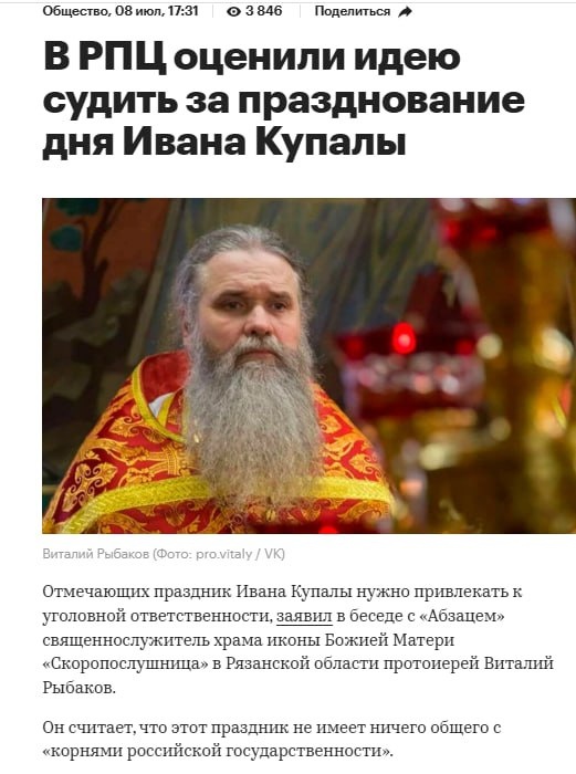 🇷🇺 Еще один повод напомнить о светском государстве В РПЦ требовали сажать россиян за празднование Ивана Купалы. Представитель церкви Вахтанг Кипшидзе назвал это чрезмерным, но отметил необходимость отказа от поддержки языческих праздников на государственном уровне. Иначе, по его мнению, мы вернемся в языческие времена. 🤔 Важно помнить: Конституция РФ запрещает единую идеологию и преследования по принципу веры. Она утверждает основы светского государства, где церковь отделена от государства. 📜 °Telegram • Zen • Bastyon° ✒️Предложить новость