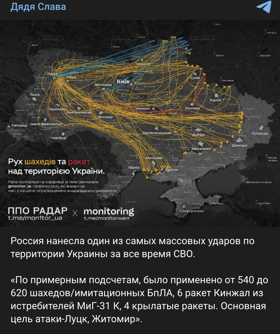 По данным российских военкоров, это был один из самых масштабных налётов за всю историю СВО: применено от 540 до 620 «Шахедов» и имитационных дронов, шесть гиперзвуковых «Кинжалов», четыре крылатые ракеты и удары с МиГ-31К и «Искандеров». Основной целью атаки стали военные аэродромы в Луцке, Житомире, Хмельницкой и других областях. В районе Староконстантинова под удар попал объект, где, по информации источников, готовят инфраструктуру под истребители F-16. Сообщения о взрывах всю ночь поступали из Киева, Харькова, Полтавы, Николаева и Конотопа. Под Киевом вспыхнул крупный пожар после атаки «Гераней».