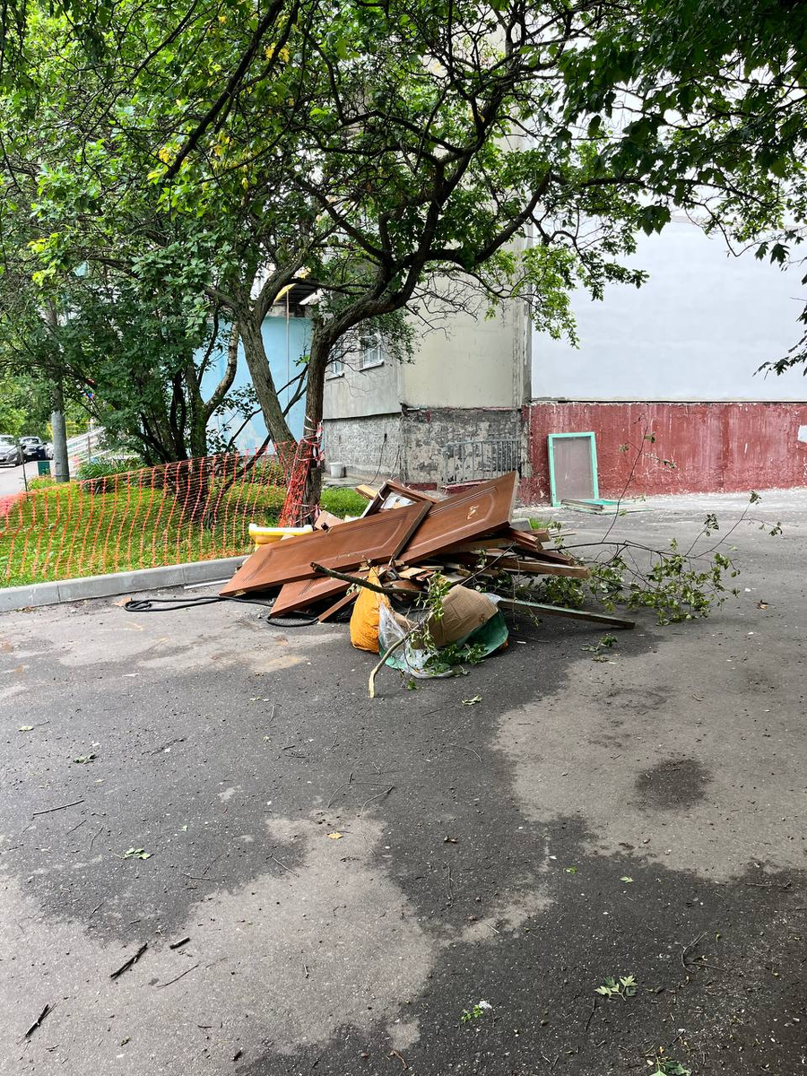 Выхожу из подъезда и вижу, что рядом на земле свалены мусор, двери из еще вчера стоявшего здесь бункер, который привезли строители. Наш дом активно ремонтируют: шпаклюют, красят стены, конопатят швы, меняют окна. Строители установили 8-кубовый бункер для своих нужд.