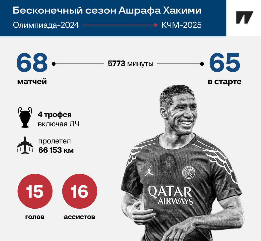 Марокканец стартовал с Олимпиады-2024 – и затем сразу в расположение «ПСЖ», не ездил в нормальный отпуск. С тех пор Ашраф практически не отдыхает. Уже 68 матчей во всех турнирах за клуб и сборную.