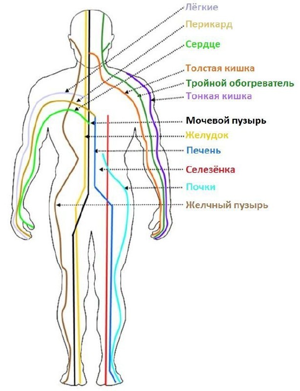 Основные энергетические каналы проходят по поверхности тела – по груди, спине, рукам и ногам. Почти все они связаны с конкретной системой органов, и это отражено в их названии. Например, меридиан селезенки, меридиан сердца, меридиан мочевого пузыря…
