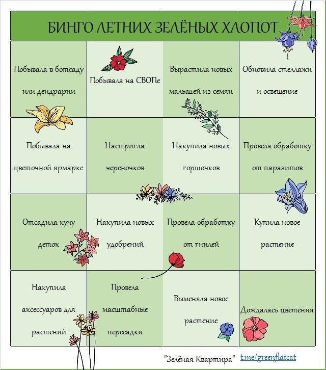 #зелёныйуход На этот раз у меня созрели не лайфхаки по уходу, а БИНГО летнего ухода и прочих прятных хлопот о растениях 📔 Лично у меня оно покрылось почти полностью, за исключением пары пунктов 🌸 Можно заполнять, распространять и делиться результатами с другими увлекающимися 🌸