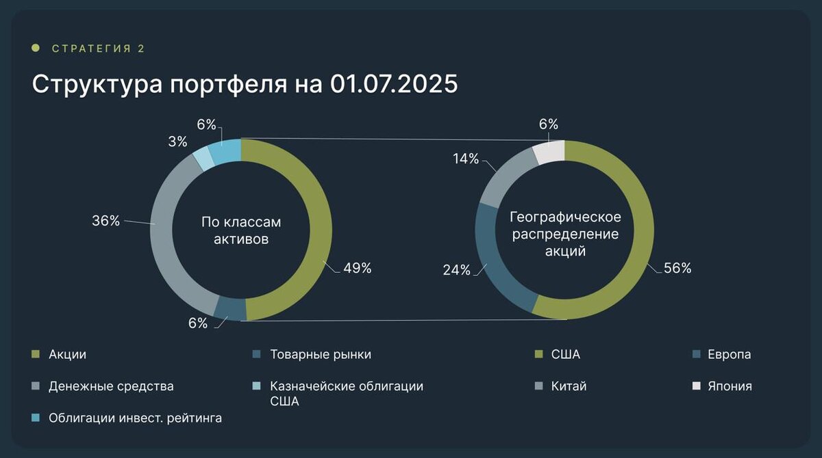 ↗️ Результаты стратегий за июнь: как повел себя умеренно агрессивный портфель на фоне мощного роста американских акций О стратегии: умеренно агрессивная стратегия с экспозицией на глобальный рынок с максимальной долей акций и ETFs на акции до 80%, а также диверсификацией по странам. Валюта: доллар ☑️ Результаты: в июне на фоне благоприятной рыночной конъюнктуры портфель вырос на 2,9%. ETF SPY прибавил 5,1%, ETF IWM — 5,5%. ETF VGK, ориентированный на европейский рынок, также продемонстрировал рост, но более скромный — на 1,8%. Китайский рынок показал очень сильную положительную динамику: ETF CQQQ вырос на 8,9%. ETF PPLT на платину продолжил радовать инвесторов и завершил месяц уверенным ростом (+19,3%) на фоне активного спроса из Китая. ETF URNM, инвестирующий в акции урановых компаний, также оказался в числе лидеров портфеля по темпам роста (+19,2%). В июне была зафиксирована прибыль в платине, но добавлен в портфель ETF на серебро — оно пока отстает в динамике от золота, цена котор