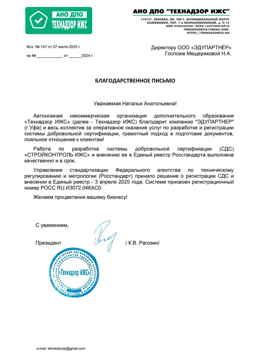 Хотим от всей души поблагодарить компанию "ЭДУПАРТНЁР" и лично директора Наталью Анатольевну Мещерякову за оперативное оказание услуг по разработке и регистрации системы добровольной сертификации, грамотный подход в подготовке документов, лояльное отношение к клиентам! Работа по разработке системы добровольной сертификации (СДС) «СТРОЙКОНТРОЛЬ ИЖС» и внесению ее в Единый реестр Росстандарта выполнена качественно и в срок. Искренне надеемся, что в ближайшее время вновь обратимся к ним с просьбой разработать СДС и они опять выполнят работу быстро и качественно.
