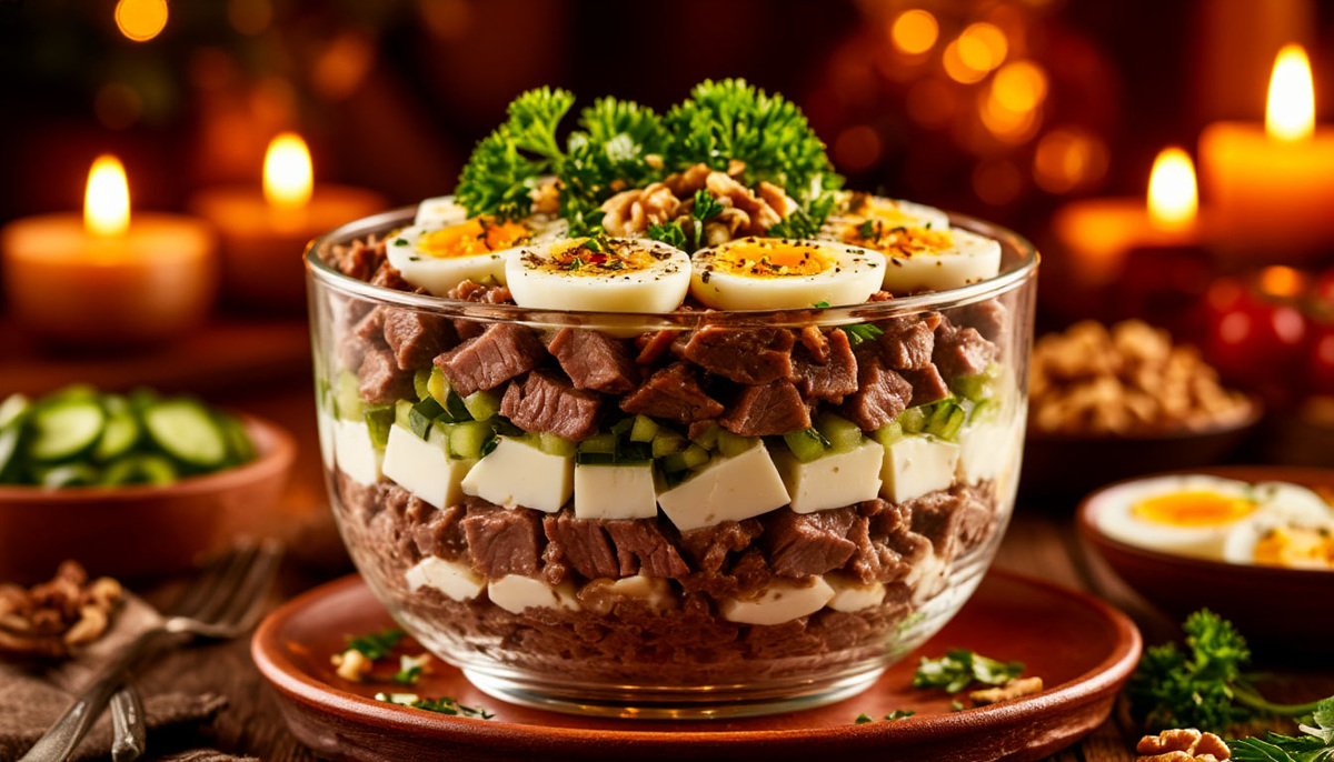 Если вы ищете сытный и эффектный салат для праздничного стола, «Принц» — отличный выбор! Этот салат сочетает нежную отварную говядину, хрустящие маринованные огурцы, яйца и ароматные грецкие орехи, а майонез придаёт блюду нежность и сочность. Все ингредиенты выкладываются слоями, создавая красивый и аппетитный вид.