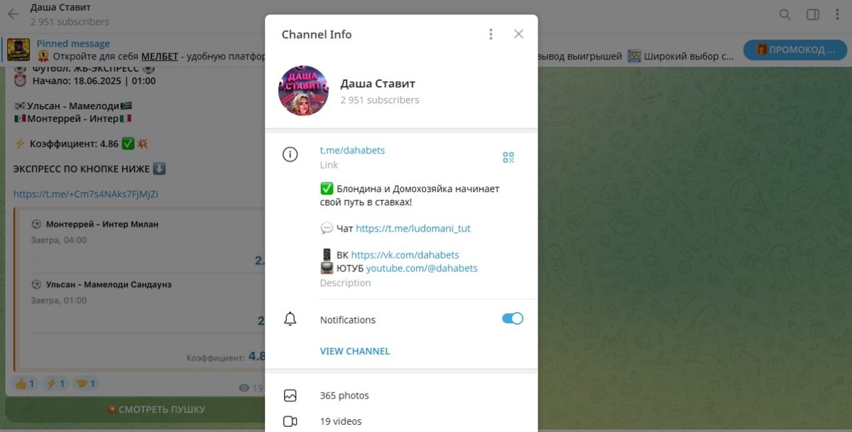 Канал появился в Telegram 31 января 2025 года. Ведёт его девушка по имени Даша, позиционирует себя как домохозяйка, увлекшаяся ставками. Публикует только футбольные прогнозы — ординары и экспрессы, иногда лайв. Контент дублируется на YouTube и VK, но основной упор — на Telegram.Подписчиков около 3000, но просмотры — всего 10% от числа аудитории. Активности в комментариях мало. Открыты только позитивные эмодзи, негатив отключён. Во всех постах — реклама БК Melbet по партнёрской ссылке. Именно на это и построена монетизация проекта. Периодически запускаются конкурсы с «призами», но в комментариях жалуются, что победителей нет. Также на канале публикуются прогнозы от сторонних проектов, а потом быстро удаляются. Формально рекламы «нет», но на деле — есть. Проект выглядит слабым и не вызывает доверия. Ни статистики, ни прозрачности, ни доказательств успешных ставок. Создан, скорее всего, с целью привлечения трафика в БК. Полезности для игроков — минимум.