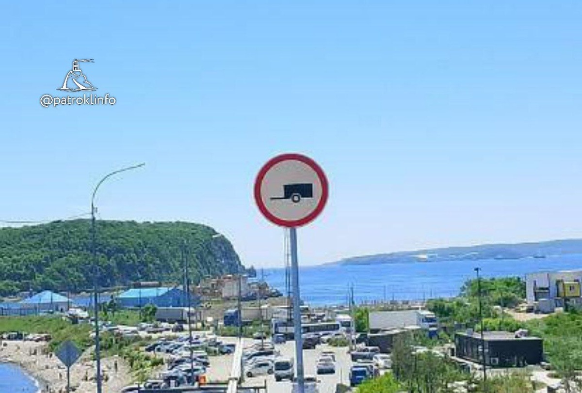 На спуске дороги к побережью бухт Соболь и Патрокл установлен знак 3.7. "Движение с прицепом запрещено". Это сделано, чтобы избавиться от стоянки фур. Город у нас портовый, т.н. разворот страны на восток увеличил грузопоток, но это не значит, что улицы и общественные пространства должны превращаться в стоянки. Задача мэрии вместе с крупными транспортными компаниями и портами обеспечивать для водителей грузовиков цивилизованные условия где-нибудь подальше от пляжей. Спасибо мэрии за знак, теперь у ГИБДД есть правовые основания для штрафов. Описание знака: Запрещается движение грузовых автомобилей и тракторов с прицепами любого типа, а также буксировка механических транспортных средств. Запрещает движение соответствующих видов транспортных средств в обоих направлениях. Действие знаков не распространяется: на транспортные средства организаций федеральной почтовой связи, имеющие на боковой поверхности белую диагональную полосу на синем фоне, эмблему организаций федеральной почтовой с