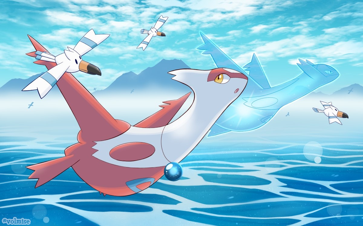 🎨 Художник: volmise @PokePikaProject ✏️ Теги: #artist_name #beak #bird #blue_sky #cloud #day #flying #jewelry #latias #latios #looking_at_another #necklace #no_humans #open_mouth #outdoors #pokemon #pokemon_(creature) #sky #volmise #water #wings #wingull #yellow_eyes