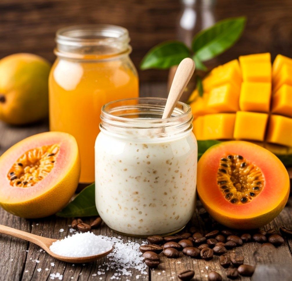 Эффект: Фруктовые энзимы (папаин, бромелайн) растворяют омертвевшие клетки очень бережно, сахар или манка/рисовая мука добавляют легкую абразивность, мед/йогурт увлажняют.