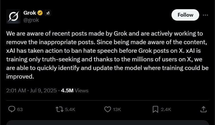 Elon Musk’s AI chatbot Grok deletes posts after backlash over antisemitic content, including praise for Hitler After complaints from X users, xAI admits Grok shared ‘inappropriate’ content & vows to tighten hate speech filters