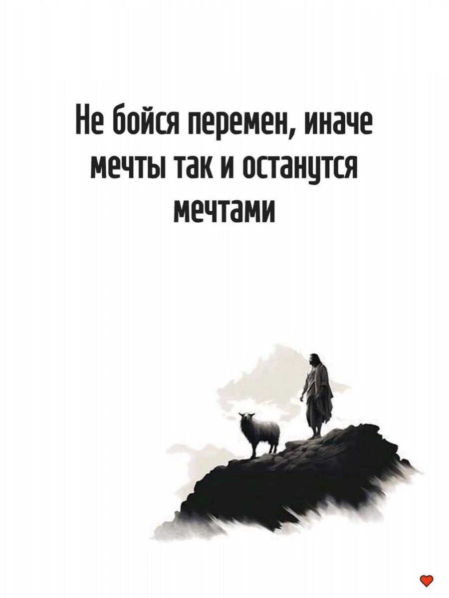 Мечтам нужно давать возможность реализоваться. Это как навык, который нужно прокачивать. Если тормозить и сопротивляться, не отпускать старое, То и мир подумает: «Да она не хочет. Ей и так норм» Ждать, что ваши мечты исполнятся и цели будут достигнуты, так себе идея. Вообще ждать - не очень штука! Никогда так не делаете, проверено роспотреб… Так можно и пожалеть об этом и «полежать на диване» вам спасибо не скажет в конце жизни. Любые перемены - это новые возможности. Давайте сегодня что-то в своей жизни изменим? Прям сейчас Сделаем нужный звонок, напишем сообщение, попросим о помощи, сделаем тот самый шаг, который страшно сделать Скажем вслух намерение: «Я готова к переменам, я готова к новым возможностям, которые сделают мою жизнь лучше» Делитесь в комментариях намерениями и шагами, которые сегодня сделаете. Легче когда делаешь в компании и поддержке ❤️