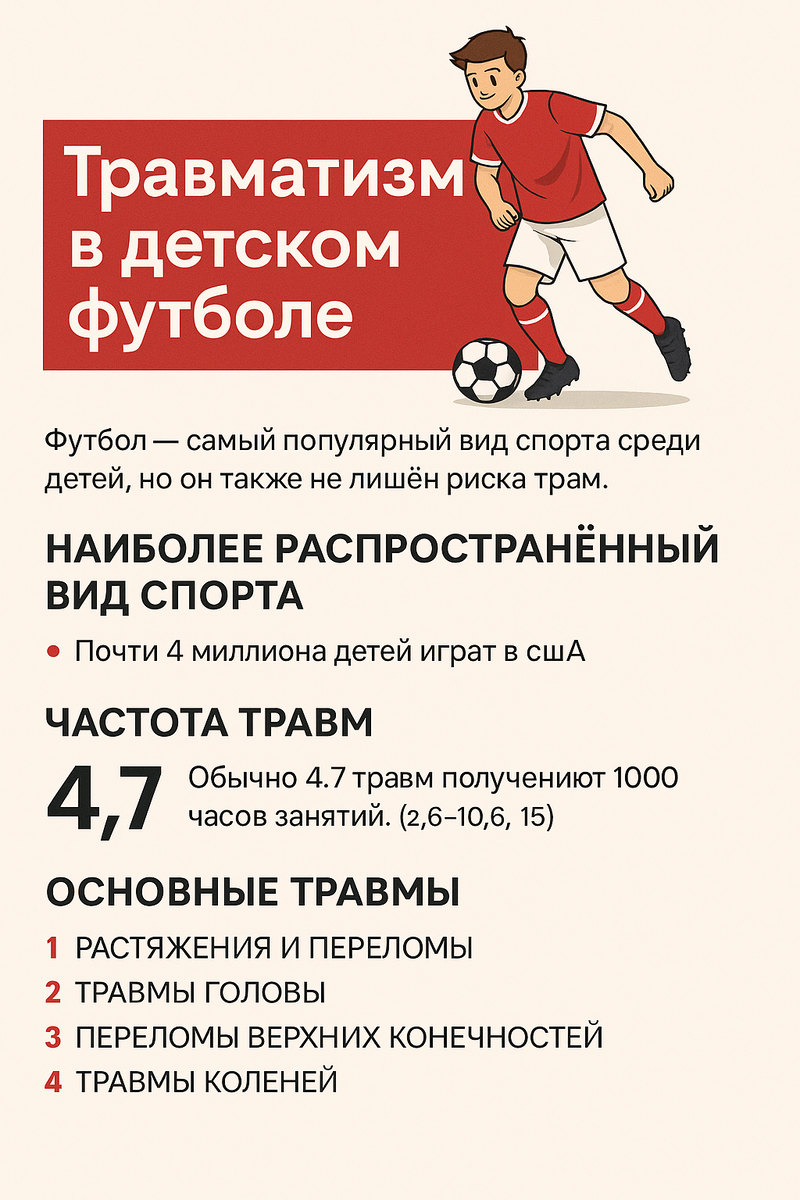 Но статистика говорит: футбол занимает лидирующие позиции по травматизму среди командных видов спорта у детей и подростков. Футбол сочетает выносливость, скорость, резкие смены направления и столкновения. Всё это — идеальные условия для травм ОДА. При регулярных тренировках: Особенно часто травмы происходят в период роста (скачки роста 10–12 и 13–15 лет) Да, если правильно распределить нагрузку и не гнаться за победой в 9 лет.