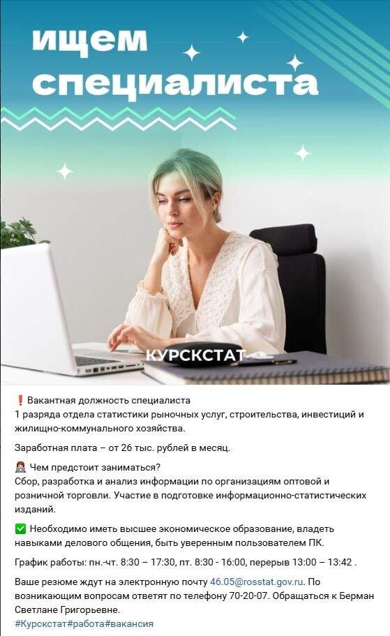 Бюджетная организация Курскстат объявила об открывшейся вакансии. Специалисту, который будет работать на 5-дневке, предлагают зарплату от 26 тысяч рублей в месяц. При этом соискателю необходимо иметь высшее экономическое образование, владеть навыками делового общения, быть уверенным пользователем ПК. Резюме ждут на электронную почту. По возникающим вопросам ответят по телефону 70-20-07.