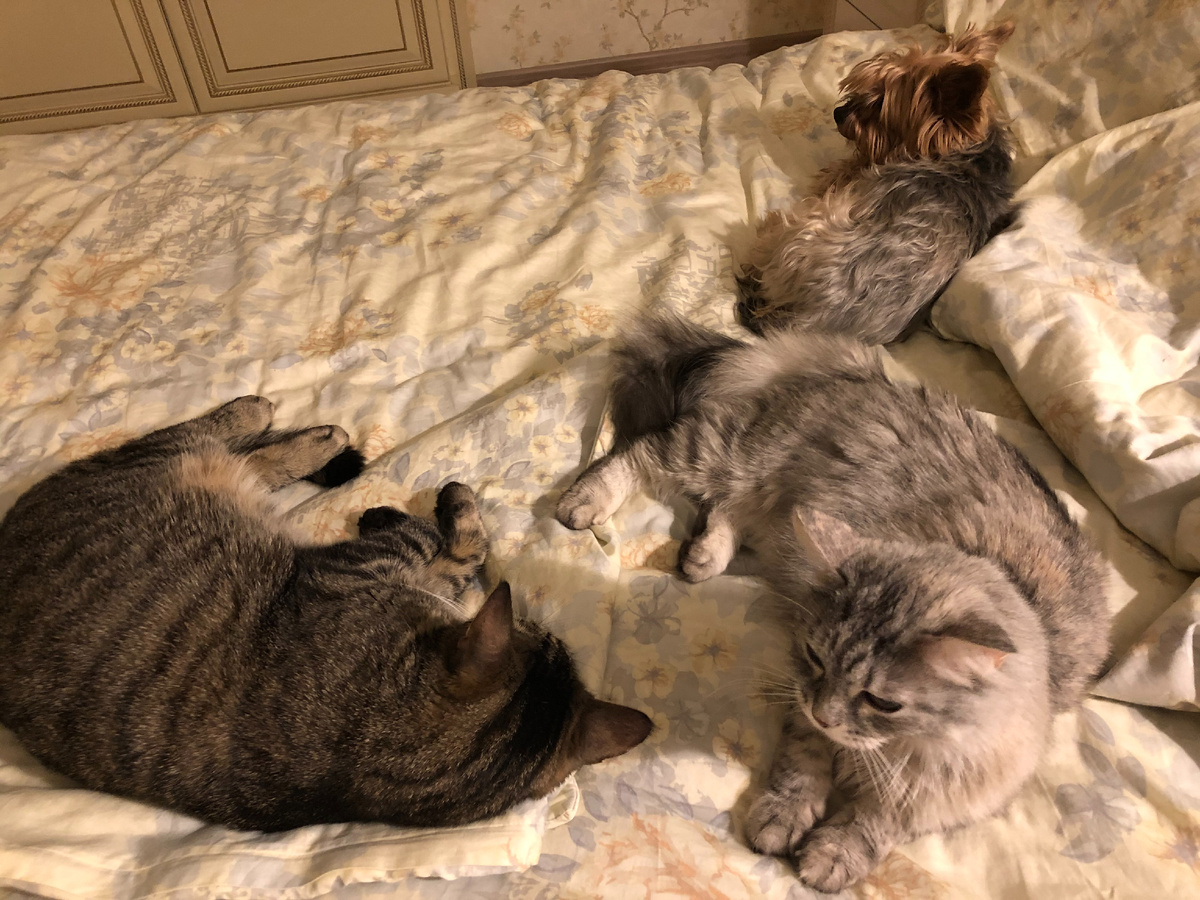 Часто, когда я занимаюсь прополкой, поливаю огород или собираю урожай, мои четвероногие друзья находятся рядом. Удобно устроившись в сторонке, они внимательно наблюдают за процессом. Причём любят сидеть все трое рядышком, бок о бок. Отдыхать днём тоже предпочитают рядом друг с другом. В доме три спальни, но спать поодиночке им неинтересно. Вечером же местом сбора становится почему-то моя кровать. Устроившись со всеми удобствами (чего не скажешь обо мне), четвероногая команда дружно отбывает в царство Морфея…