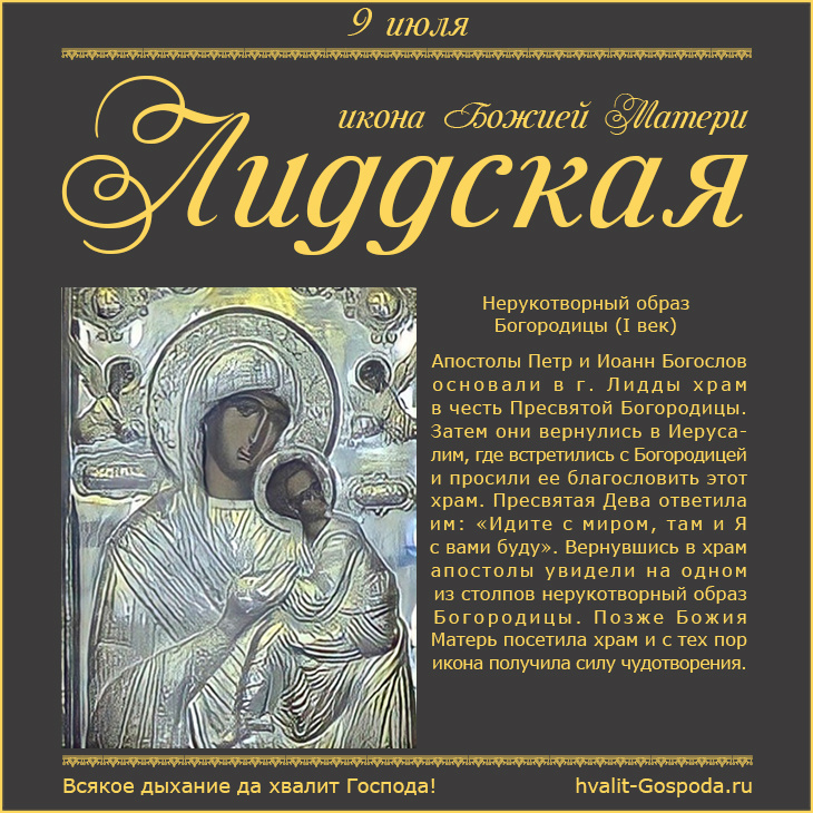 Согласно преданию Лиддская икона Божьей Матери была создана не человеческими руками. Икона-прообраз явилась очень необычно в городе Лидды находящегося на территории Палестины.