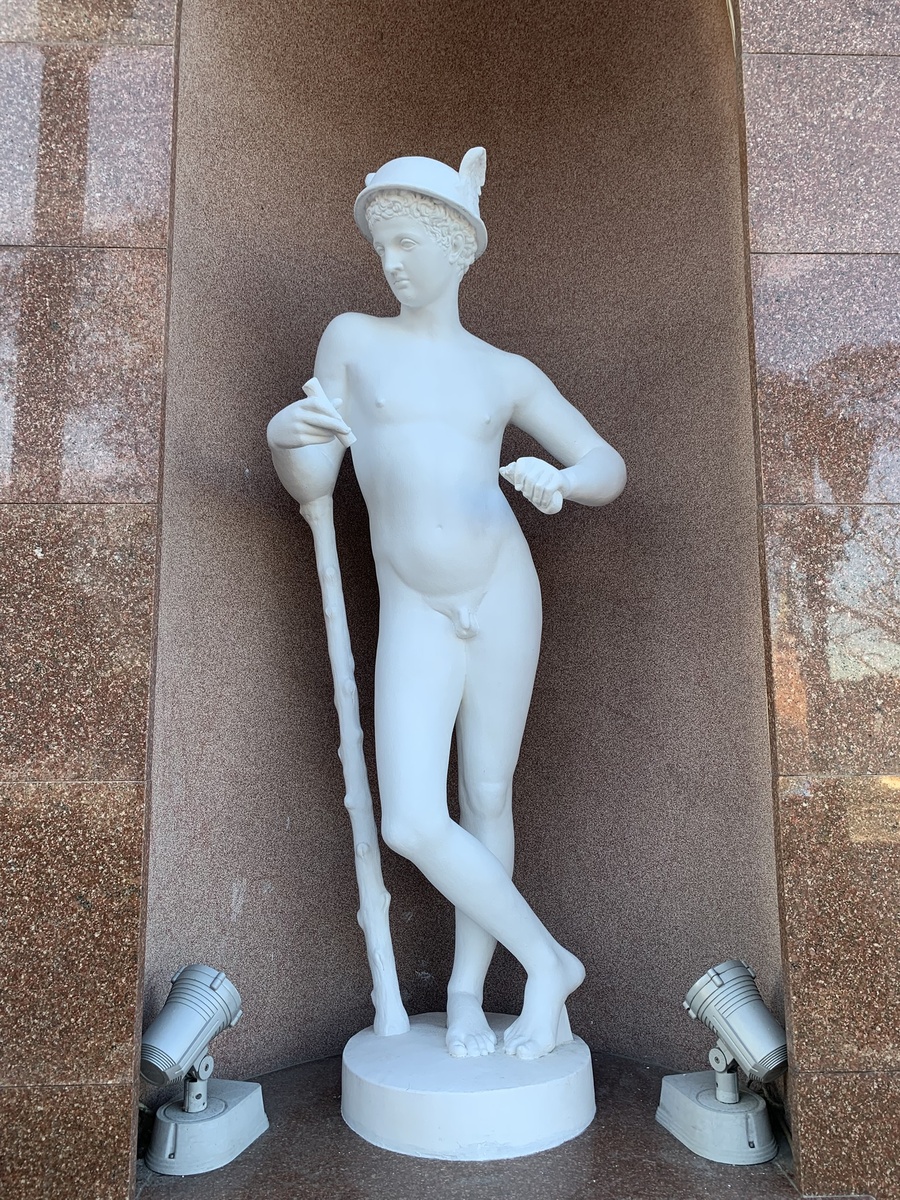 У входа в Художественную галерею Шилова красуется прелестная статуя молодого человека, чьи черты лица и изящность фигуры сразу же привлекают внимание. Многие прохожие задаются вопросом: «Кто этот таинственный незнакомец?» Согласно распространённой версии, перед нами воплощение самого бога торговли — Меркурия. Но так ли это? В мифологии Древнего Рима этому божеству присущи несколько характерных атрибутов: 1. Крылатый шлем