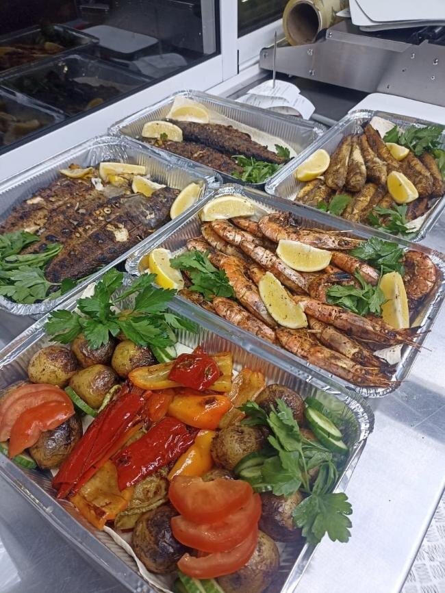 Меню полностью представлено на сайте «Рыбоеда». Всего много: разнообразная «нешаурма» с креветками, кальмарами, мидиями, тунцом, судаком. Рыба на углях, морепродукты на мангале, овощи на огне, супы и напитки. На мангале рыбу пожарят за 15 минут: дорадо, сибас, форель, скумбрия, корюшка, камбала. И еще подарят соус, лаваш и лимон. Всё качественное и свежее. Можно купить и сразу съесть, можно заказать доставку или самовывоз по телефону 8-910-451-76-26.