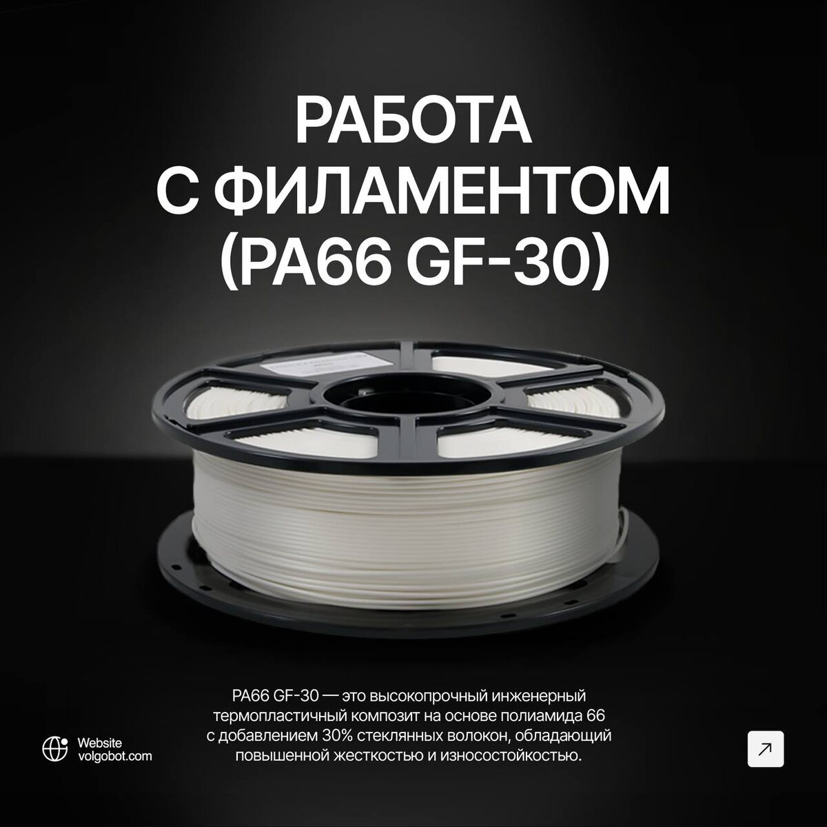 Привет, друзья! Мы продолжаем рубрику: Советы по филаментам от Volgobot, и сегодня расскажем вам о работе с PA66 GF-30 — прочном и надежном материале для промышленной 3D-печати. PA66 GF-30 — это нейлоновый композит, армированный 30% стекловолокна. Сочетает в себе высокую прочность, жесткость и термостойкость. Благодаря стекловолокну материал отлично выдерживает механические нагрузки, устойчив к износу и воздействию химических веществ. Поэтому он — идеальный выбор для деталей, работающих в экстремальных условиях. PA66 GF-30 широко применяется в автомобильной, аэрокосмической и промышленной сферах, где требуются легкие, но прочные компоненты. Материал позволяет создавать детали с высокой стабильностью размеров и долговечностью, что особенно важно для функциональных прототипов и готовых изделий. Однако при работе с PA66 GF-30 важно учитывать его особенности: - Требует специализированного оборудования – материал склонен к деформации, поэтому рекомендуется использовать 3D-принтеры с закрыто