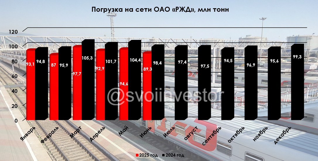 🚂 По данным РЖД легко отслеживается динамика перевозки грузов, за каждым сырьём стоит та или иная компания, поэтому на основе показателей можно сделать вывод об успешности сектора. Давайте рассмотрим данные за июнь: 💬 В июне погрузка составила 89,3 млн тонн (-9,2% г/г, в мае — 94,6 млн тонн), 13 месяцев подряд погрузки ниже 100 млн тонн, в 2025 г. уже 2 раз уходят ниже 90 млн тонн, обвал продолжается и это при низкой базе прошлого года. Напомню вам, что последний раз положительная динамика была показана в сентябре 2023 г. (100,9 млн тонн, +0,2% г/г), как итог — 21 месяц подряд снижения. 💬 Погрузка за 2025 г. составляет 554,5 млн тонн (-7,6% г/г), продолжаем двигаться в одном направлении по цифрам с кризисным 2009 г. Теперь переходим к самому интересному, а именно к погружаемому сырью: 🗄 Каменный уголь — 24,9 млн тонн (-4,6% г/г) 🗄 Нефть и нефтепродукты — 16,2 млн тонн (-1,8% г/г) 🗄 Железная руда — 8,8 млн тонн (-4,4% г/г) 🗄 Чёрные металлы — 4,1 млн тонн (-22,6% г/г) 🗄 Химически