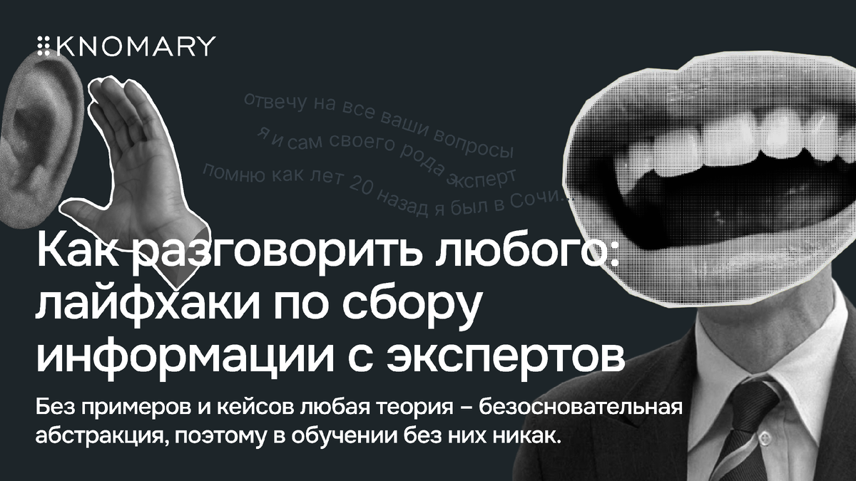 Одно дело сказать «Вкладываться в финансовые пирамиды – неразумно, вы ничего не заработаете», а другое привести пример: «В девяностые почти 10 млн человек вложились в компанию МММ и потеряли свои деньги. С тех пор схемы построения финансовых пирамид изменились, но прежним осталось одно – денег там не заработать». Проблема в том, что теорию можно найти в разных источниках, а истории из практики конкретной организации часто прячутся в головах экспертов. Они могут знать бесконечно много ценных кейсов, но вспомнить их и рассказать по запросу получается не всегда. Провести интервью, чтобы собрать опыт с эксперта, – задача со звездочкой для разработчика курсов. В этой статье поделимся инструментами и лайфхаками, которые помогают разговорить кого угодно. Если спрашивать прописные истины у занятого топ-эксперта, он может возмутиться и прервать встречу. Другая крайность – когда эксперт настолько увлекается своим монологом, что превращает его в лекцию на три часа, где по вашему вопросу будет два