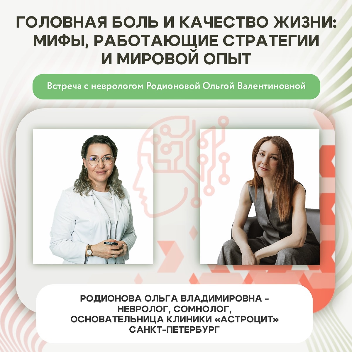 Анонсирую долгожданную встречу с неврологом, сомнологом, цефалгологом, кандидатом медицинских наук, главным врачом и основательницей клиники «Астроцит» (Санкт-Петербург) Родионовой Ольгой Валентиновной.