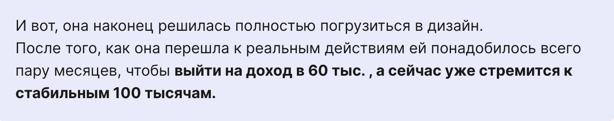 Теперь за лето я хочу выйти на доход 100к/мес и выше. А в перспективе - уйти из найма и сделать дизайн основным источником дохода.
