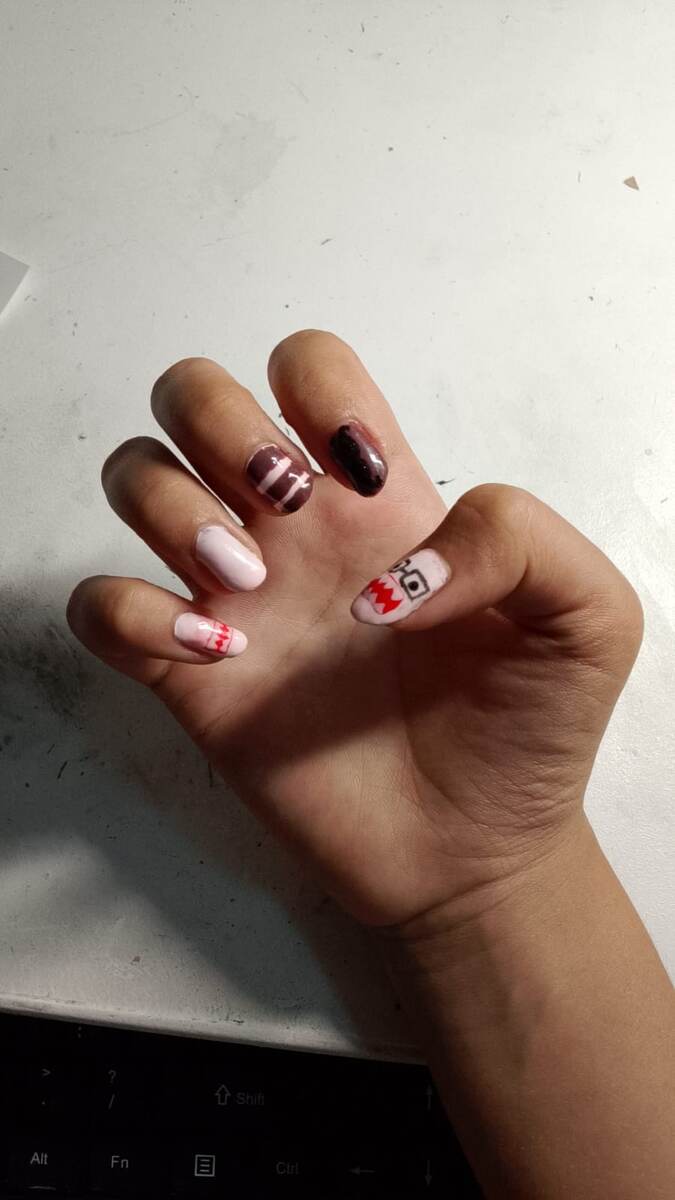 Всем привет! Сегодня я сделала себе новый маникюр! Он в коричнево-розовой-красной тематике! На больших пальцах у меня расположены монстрики в очках, на указательных усы, на средних полоски, на пред последнем пальце просто залила одним цветом, а на мизинце я сделала влюбленного монстрика! Только на мизинце левой руки я еще не успела сделать(. Маникюр — это комплекс процедур по уходу за ногтями и кожей рук. Он включает придание формы ногтям, удаление кутикулы, шлифовку ногтевой пластины, покрытие лаком или гель-лаком, уход за кожей рук. Кстати, с каждой новой работой у меня получается красивей и лучше! А вы когда то делали себе маникюр или вам? Напишите в комментарии какой дизайн вам делали. Ну, а я прощаюсь всем до встречи и пока!