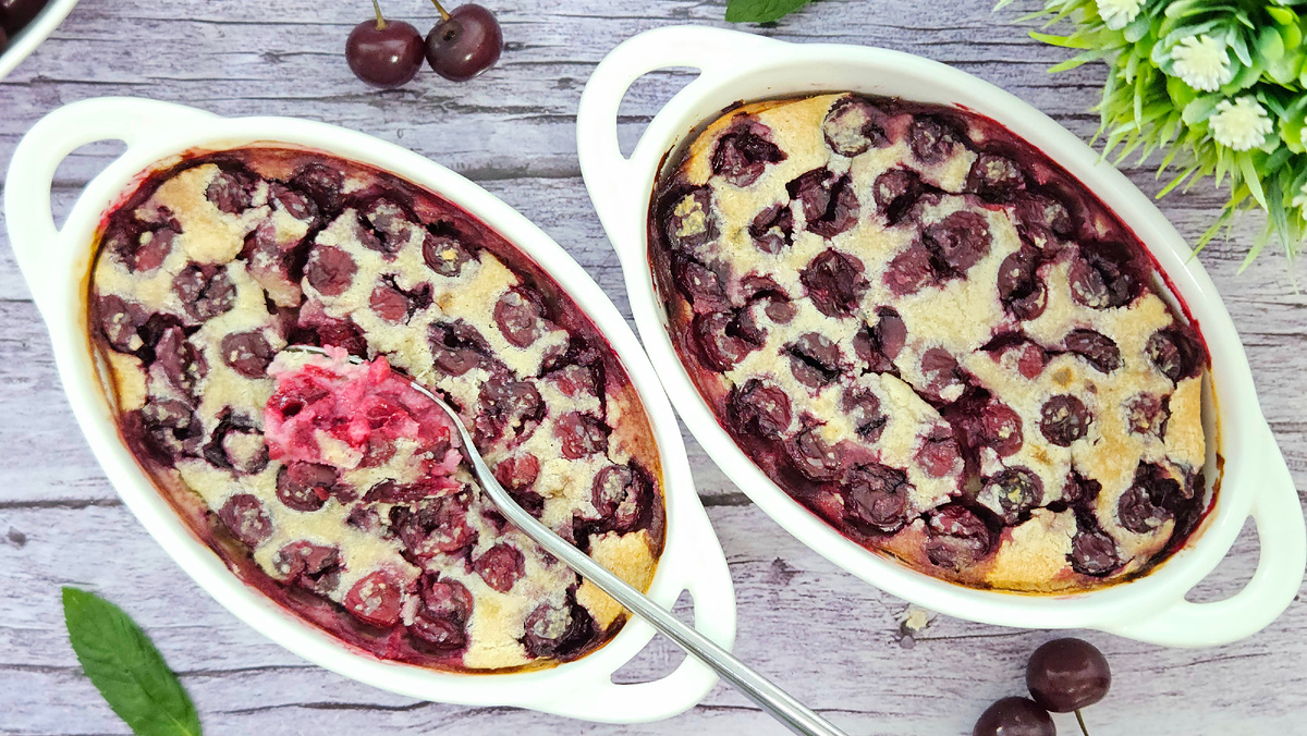 Если вы следите за питанием, но не готовы отказываться от вкусного, этот рецепт диетического клафути с вишней станет настоящей находкой. Французский десерт, который традиционно готовится на основе яиц, сливок и сахара, в этом варианте становится легким и полезным — без ущерба для вкуса: с овсяной мукой, без сахара и с минимальным количеством масла. Выход: 500 гр КБЖУ на 100 гр: 135,38/5,60/5,86/15,02 Подсластитель - 1 грамм моего подсластителя пребиосвит фитнес = 10 гр сахара К молоку добавить сливочное масло. Подогреть в микроволновке до его растворения. В миску разбить яйца. Добавить тёплое молоко, подсластитель и ванилин. Взбить венчиком. Всыпать муку с разрыхлителем. Перемешать до получения гладкого теста без комочков. По консистенции тесто похоже на блинное. Из вишни удалить косточки. Если используете замороженную — предварительно разморозить и слить лишнюю жидкость. Я выпекать клафути буду в порционных формочках объёмом 300 мл каждая, но можно взять одну диаметром 16 см. Виш
