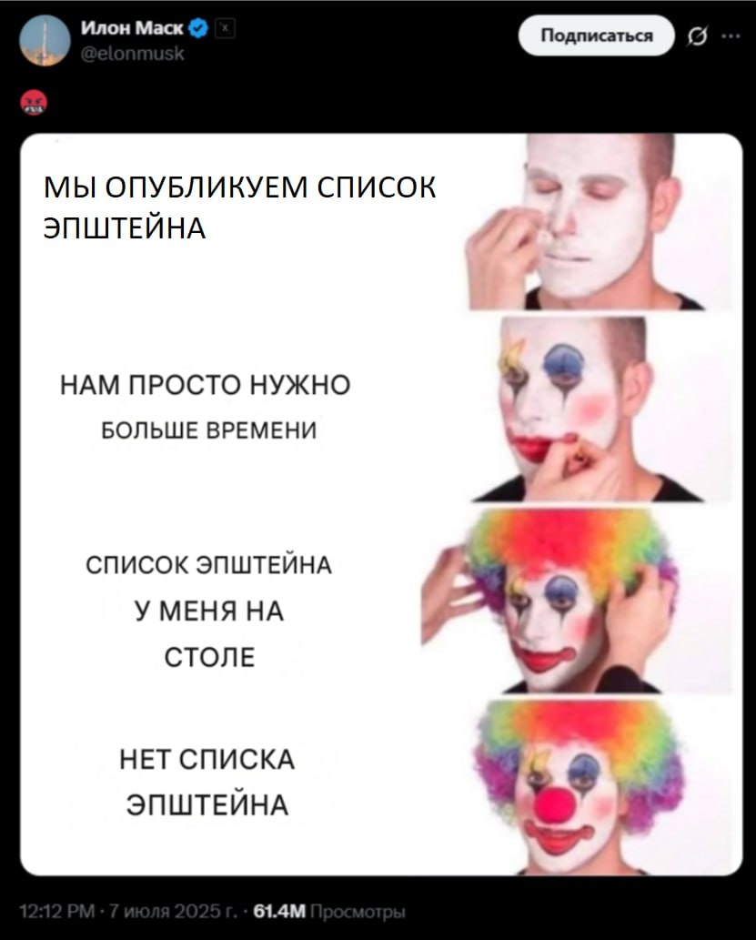 На видео левые обсмеивают ситуацию со обнародованием «списка Эпштейна», которое обещало сделать администрация Трампа. На видео упоминается только Генпрокурор США, но глава ФБР также обещался это сделать. Естественно, к стебу подключился Илон Маск, но я бы обратил внимание, что его ИИ Grok, в соцсети Х, тоже подливает масла в огонь, к шуточному твиту «Вавилонской пчелы».