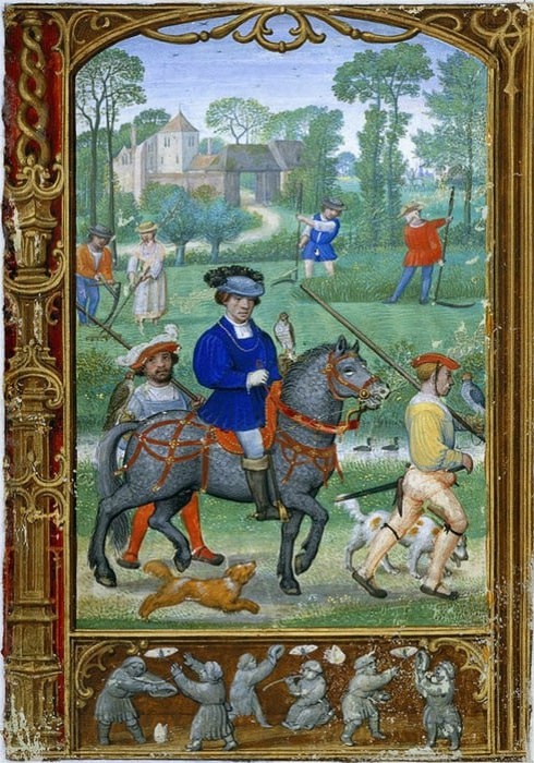 🌅На миниатюре (1) можно наблюдать соколиную охоту, как основное летнее занятие аристократов. На переднем плане – дворянин с соколом на руке верхом на лошади, его сопровождают две собаки и двое слуг, которые несут других хищных птиц. На заднем плане группа косарей работает в поле, внизу – сцена ловли бабочек.