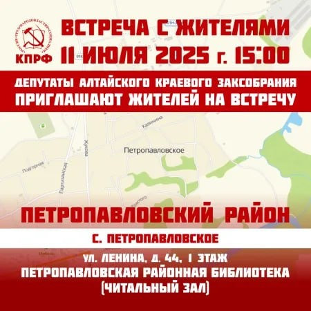 ⚡️В с. Петропавловское, расположенном в Петропавловском районе, состоится встреча жителей с руководством фракции КПРФ в Алтайском краевом Законодательном Собрании.