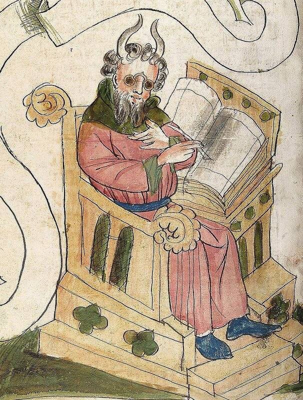 Наиболее прозорливые наши читатели уже догадались, что на иллюстрации изображен Моисей. Его, конечно, снабдили символами учёности: очки, перо и книга. А для солидности его также нарядили в современный автору монашеский прикид. Но вот рога — благодаря им спутать его ни с кем невозможно.