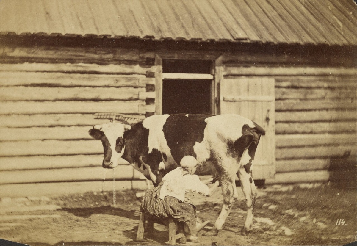 Доение коровы. Россия, 1860–1870. Фотограф Вильям Каррик